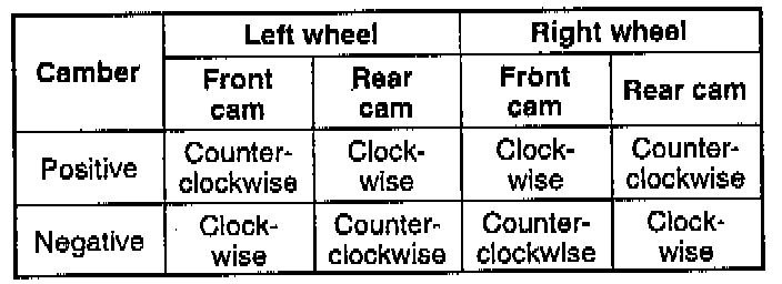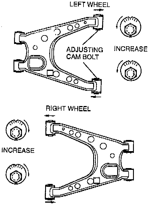 2. Turn the front and rear adjusting cam bolts the same amount in the opposite direction to provide the correct camber angle.