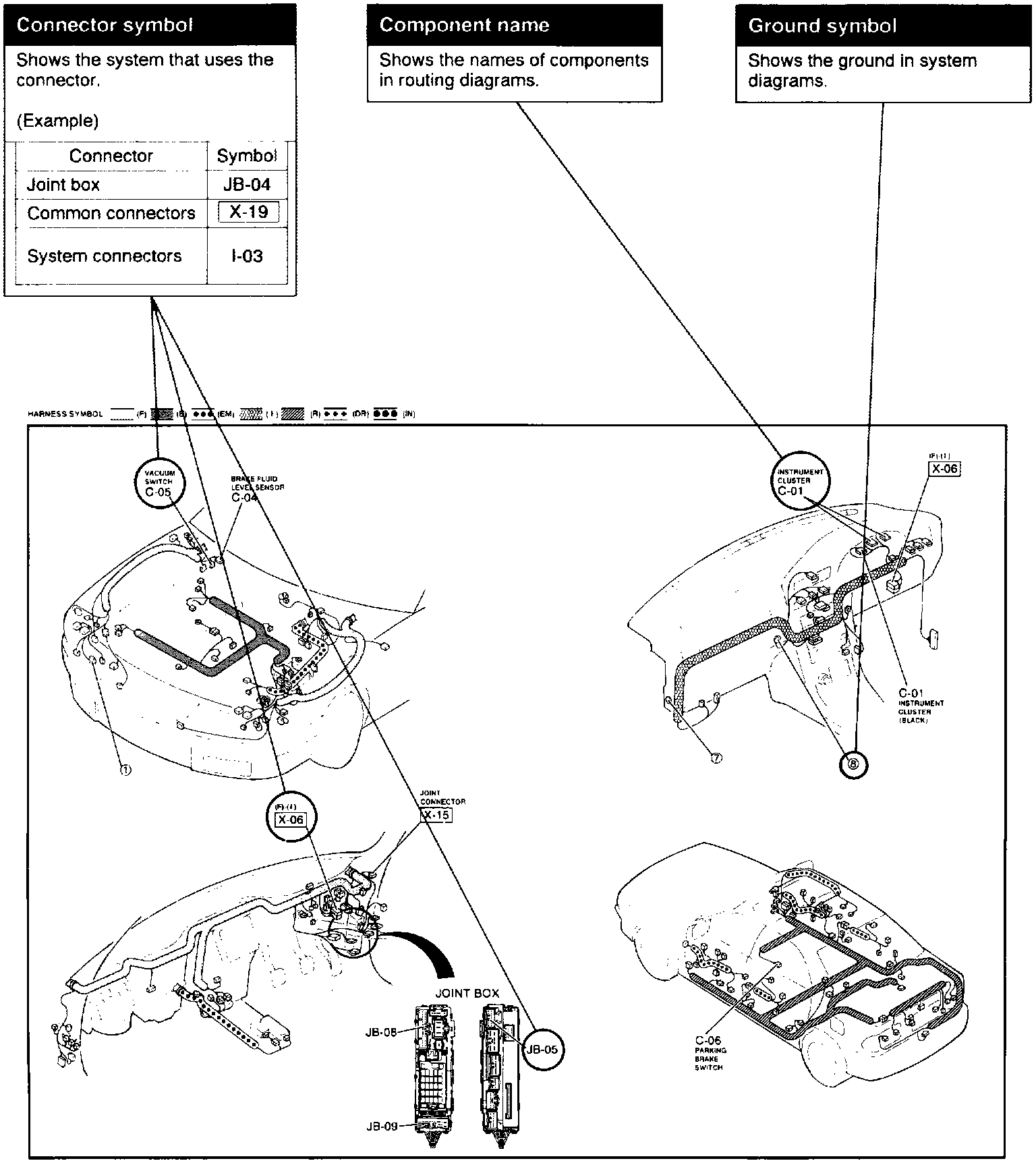 The routing diagram shows where electrical components are on the system circuit diagram by call outline and connector symbols.
