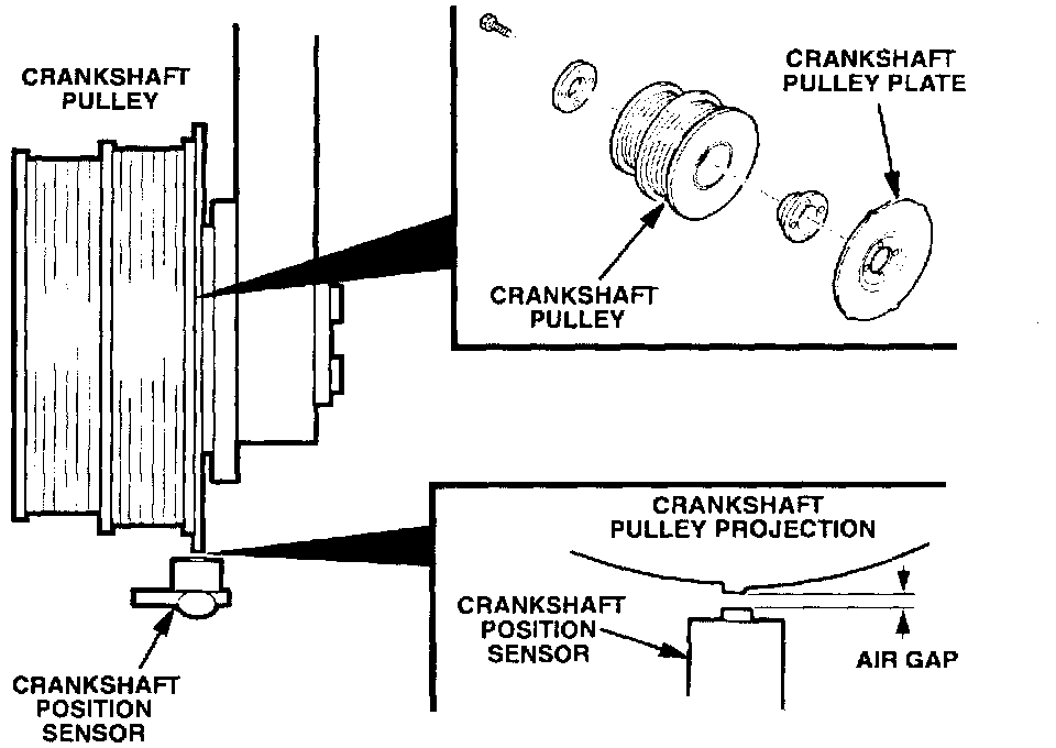 3. Using a feeler Gauge, adjust the air gap between the crankshaft pulley projection and the position sensor. Adjust within the following range. Air Gap: 0.5 mm - 0.8 mm (0.020 - 0.031 in.).