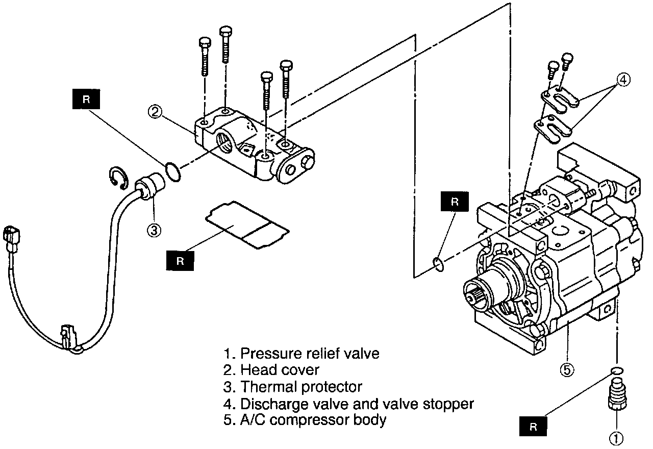 2. Make sure the compressor body and surfaces of the discharge valve and valve stopper are free from foreign material before installing then.