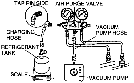 2. Connect the tap pin side of the charging hose to the air purge valve of the manifold gauge.