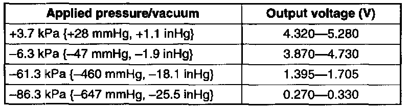 3. Decrease the applied pressure from +3.7 kPa (+28 mm/Hg, +1.1 in.Hg) to -86.3 kPa (-647 mm/Hg, -25.5 in.Hg) and verity that the PCM terminal 34 voltage decreases linearly.
