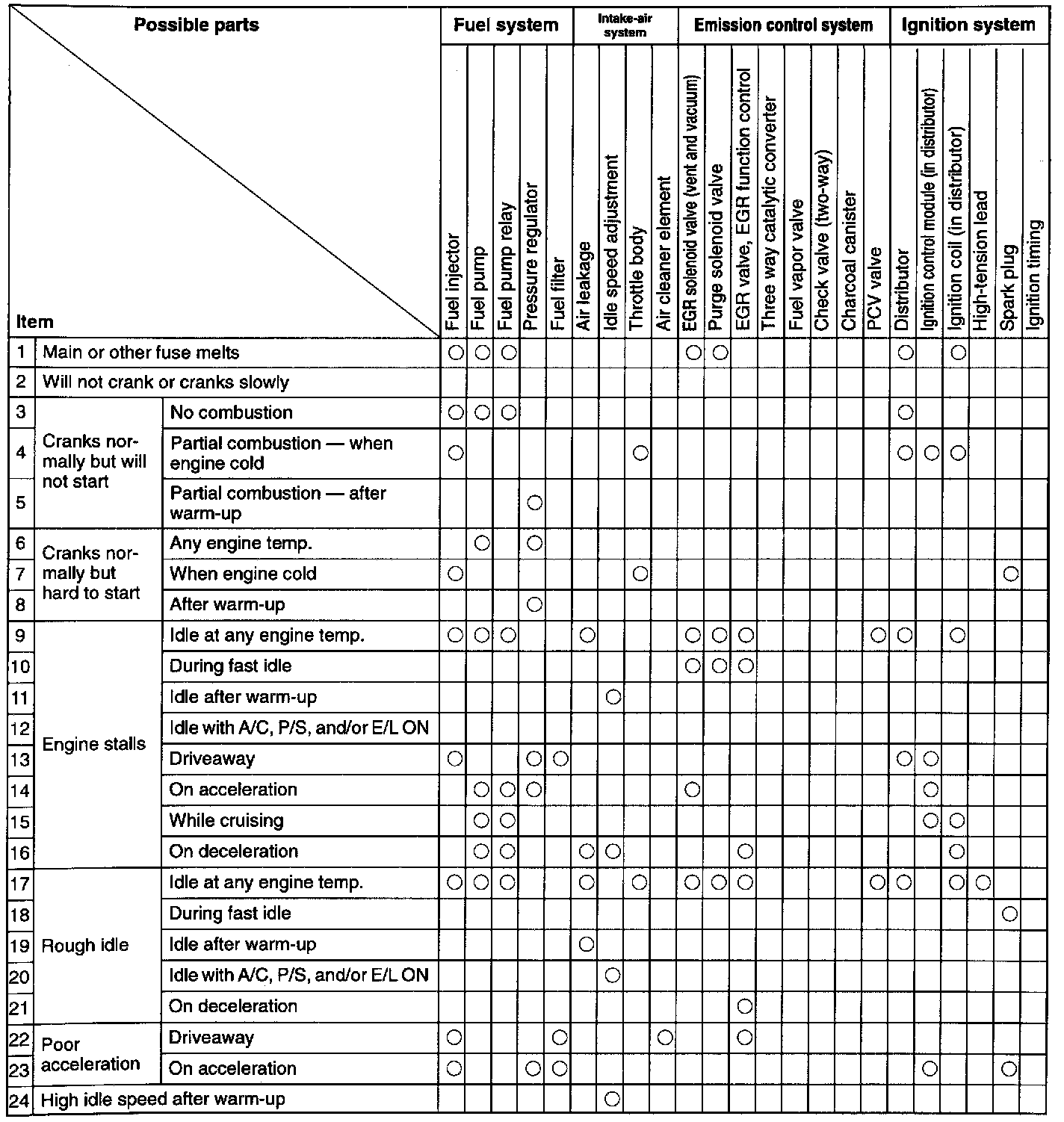 NOTE: These Quick Diagnosis Charts show the relationship between troubleshooting items and inspection points.