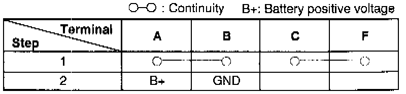 2. Apply battery positive voltage and check for continuity between the terminals of the starter cut relay.