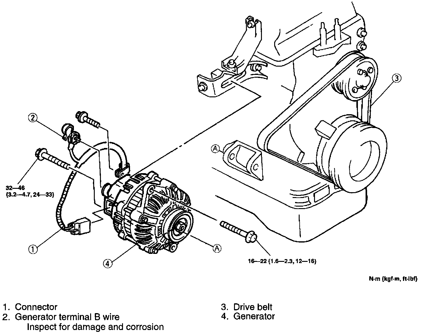 ^ When the battery cables are connected, touching the vehicle body with generator terminal B will generate sparks. This can cause personal injury, fire, and damage to the electrical components. Always disconnect the battery before performing the following operation.