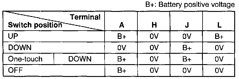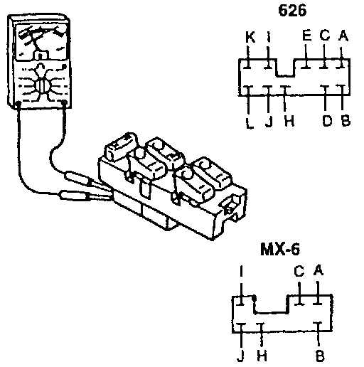 4. Connect the power window main switch connector and measure the voltage at the following terminals. (Only 626 driver's side)