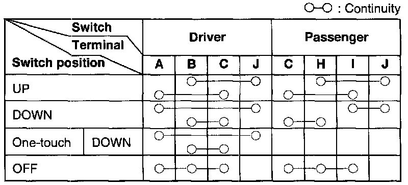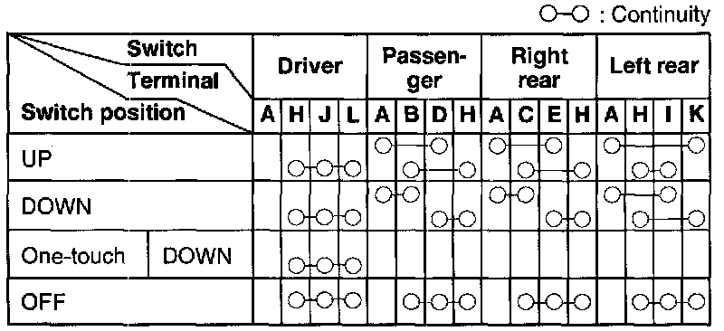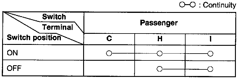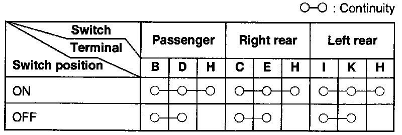 2. Check for continuity between the main switch assembly terminals with the power-cut switch in the following positions.