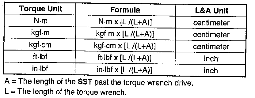 When using a torque wrench-SST combination, the written torque must be recalculated due to the extra length that the SST adds to the torque wrench. Recalculate the torque by using the following formulas. Choose the formula that applies to you.