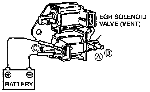 4. Apply battery positive voltage to terminal A and ground terminal B of the EGR solenoid valve (vent). Verify that air flows as shown below.