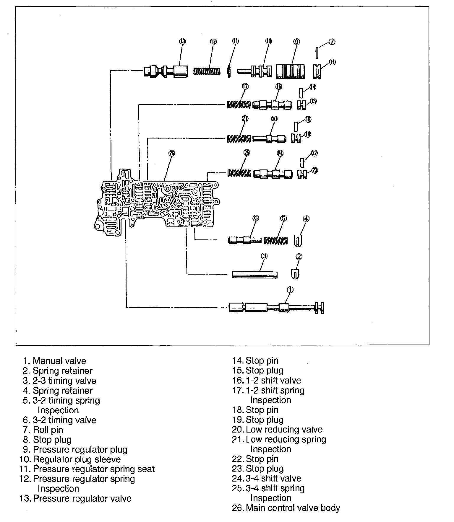 1. Insert the 3-4 shift spring, 3-4 shift valve, and stop plug. Secure them with the stop pin.