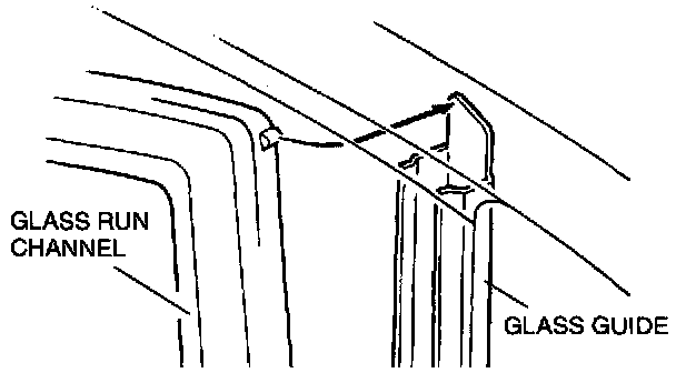 ^ Align the dowel of the glass run channel with the edge of the glass guide then install the glass run channel.