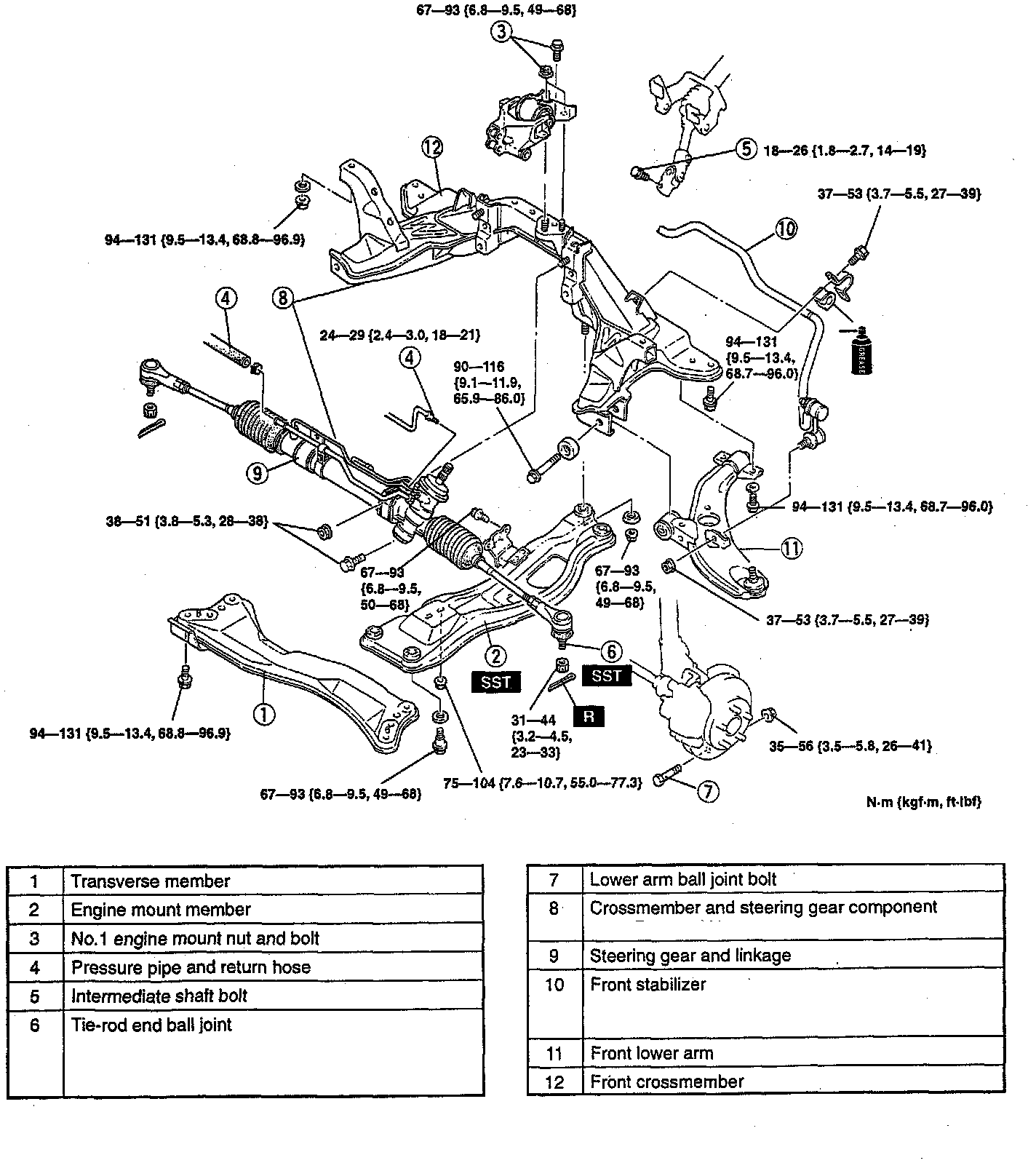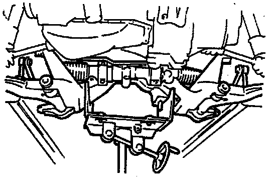 1. Support the crossmember by using a jack and remove the bolts and nuts.