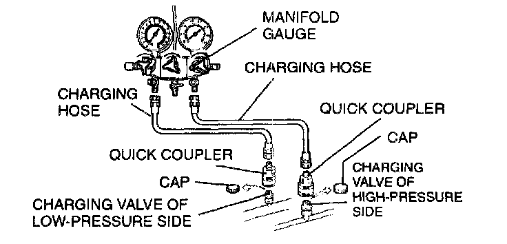 2. Connect the charging hoses to the high- and low-pressure side joints of the manifold gauge.