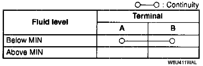 4. Remove the brake fluid and verify that there is continuity when the level is below MIN.