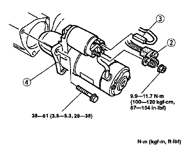 WARNING: When the battery cable are connected, touching the vehicle body with starter terminal B will generate sparks. This can cause personal injury, fire, and damage to the electrical components. Always disconnect the battery before performing the following operation.1. Remove the battery.