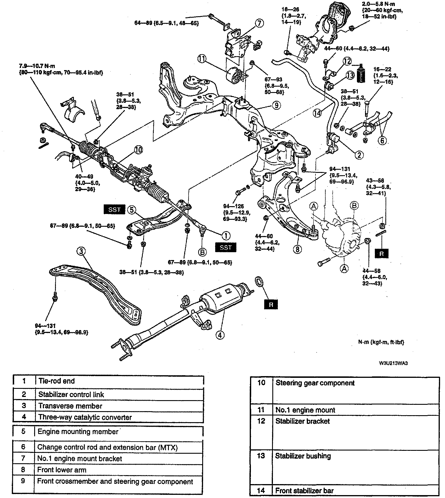 1. Support the crossmember by using a jack being careful to not let the crossmember fall, and remove the bolts and nuts.