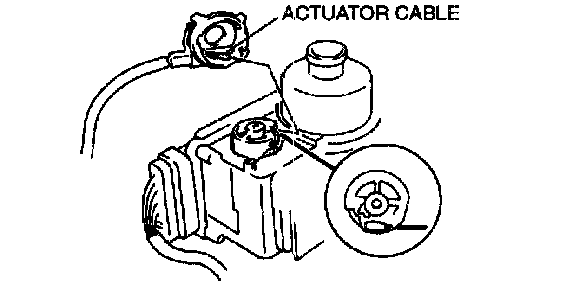 Remove the actuator cable cap from the cruise actuator by pushing the actuator cable cap tab and rotating the actuator cable cap counterclockwise.