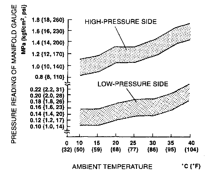 12. If the high and low-pressure side readings are in the shaded zones shown in the figure, the refrigerant system is normal.