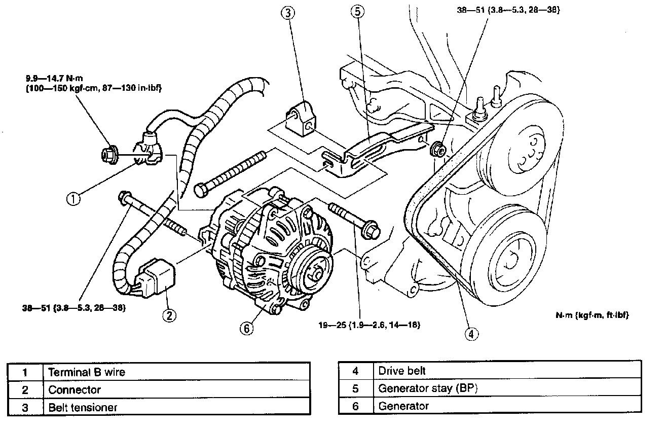 WARNING:^ When the battery cables are connected, touching the vehicle body with generator terminal B will generate sparks. This can cause personal injury, fire, and damage to the electrical components. Always disconnect the battery before performing the following operation.