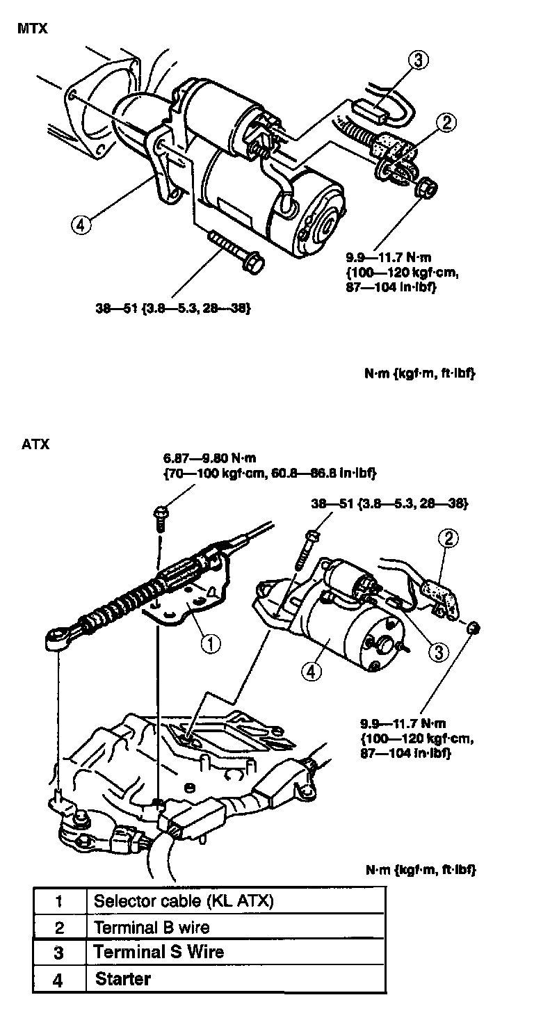STARTER REMOVAL/INSTALLATION (KL 2.5L V6)WARNING: When the battery cable are connected, touching the vehicle body with starter terminal B will generate sparks. This can cause personal injury, fire, and damage to the electrical components. Always disconnect the battery before performing the following operation.