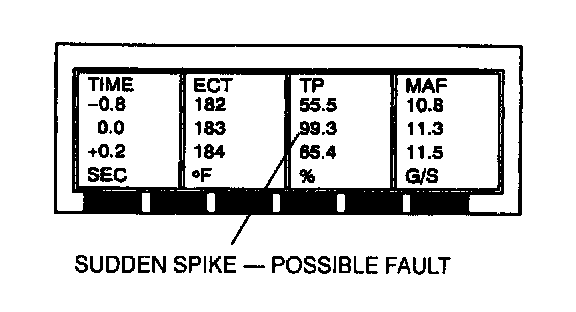 Notice the major jump in the TP voltage while scrolling through the information. This example would require a smooth and progressive throttle pedal travel during a key ON and engine OFF mode.