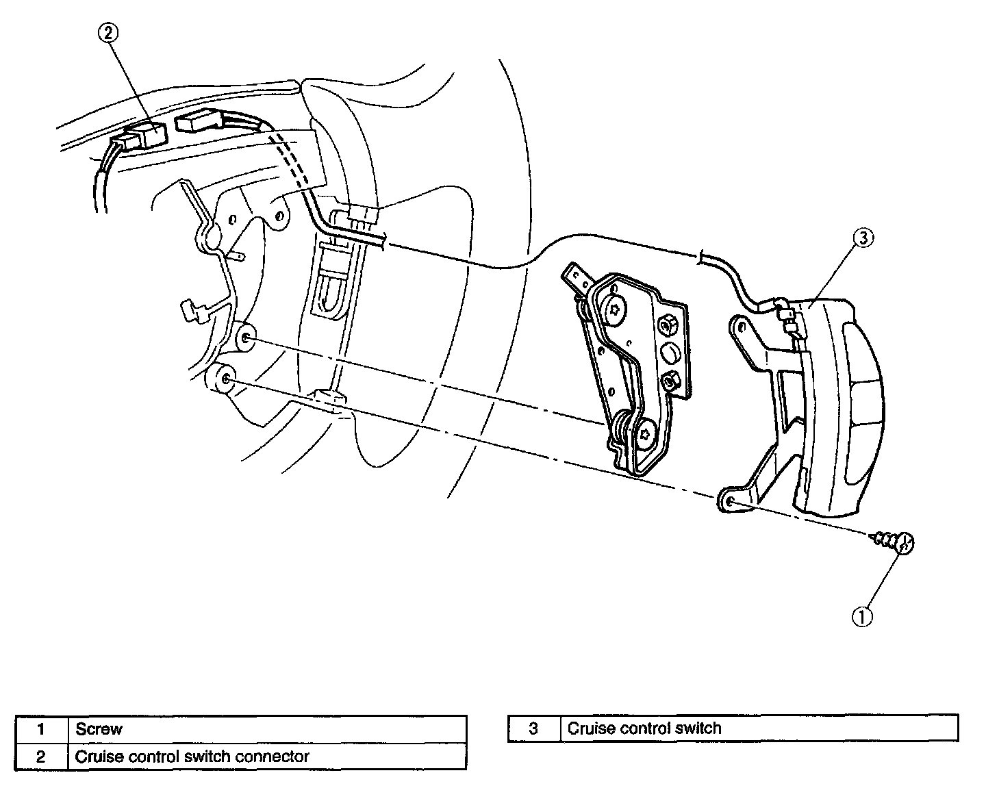CRUISE CONTROL SWITCH REMOVAL/INSTALLATIONWARNING: Handling the air bag module improperly can accidently deploy the air bag, which may seriously injure you. Read AIR BAG SYSTEM SERVICE WARNINGS, before handling the air bag module. (Refer to AIR BAG SYSTEM SERVICE WARNINGS.)