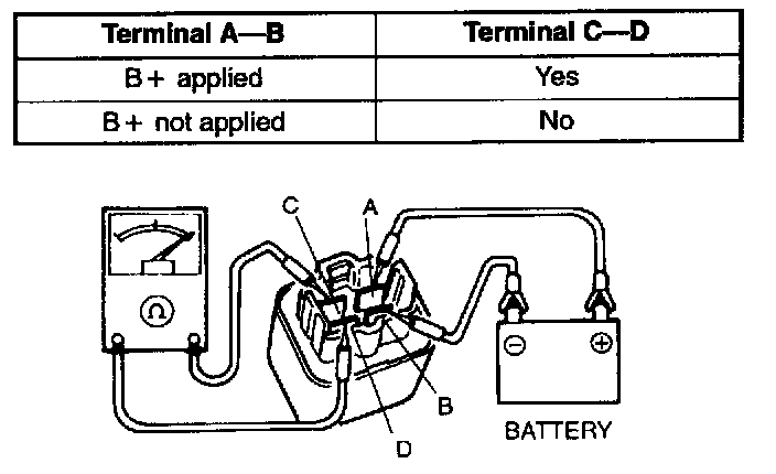 2. Apply battery positive voltage and inspect continuity between terminals of the relay by using an ohmmeter.