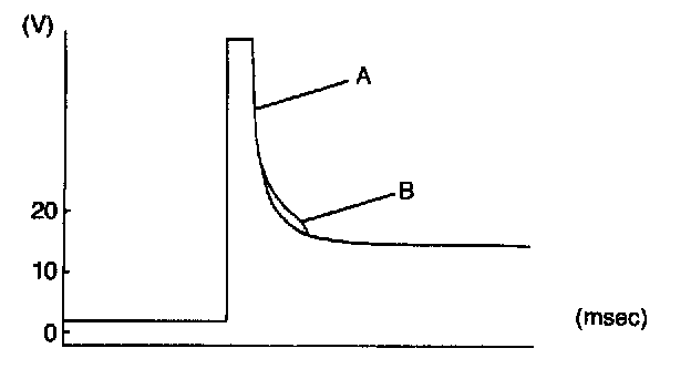 - Counter electromotive voltage A, generated when the three-way solenoid valve or the fuel injector is turned off from on, shows irregular convergence because induced electromotive voltage B, generated by the plunger return operation, is added to it.