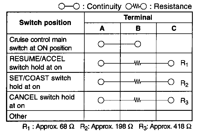 4. Measure the resistance and inspect for continuity between the cruise control switch terminals using an ohmmeter.