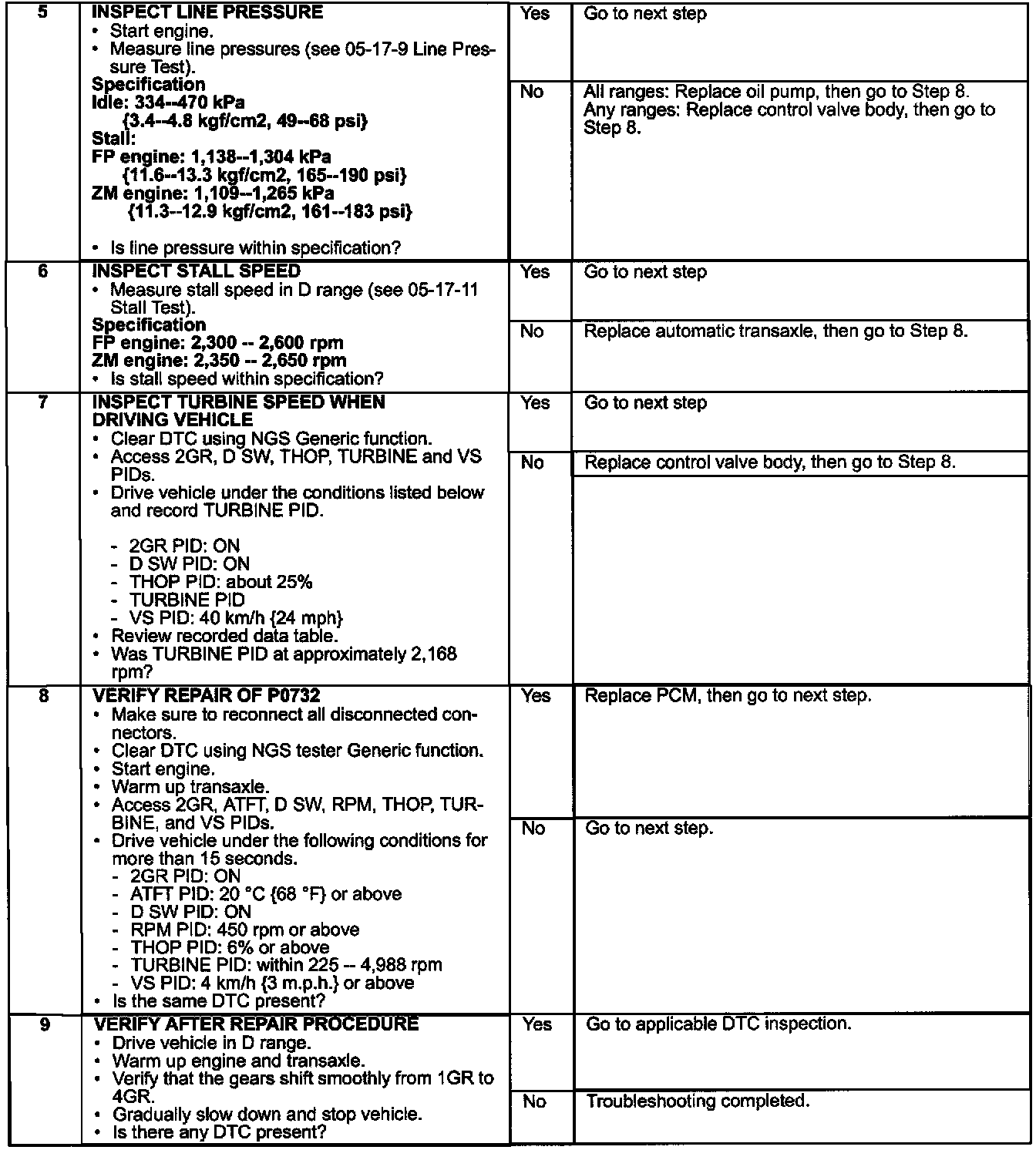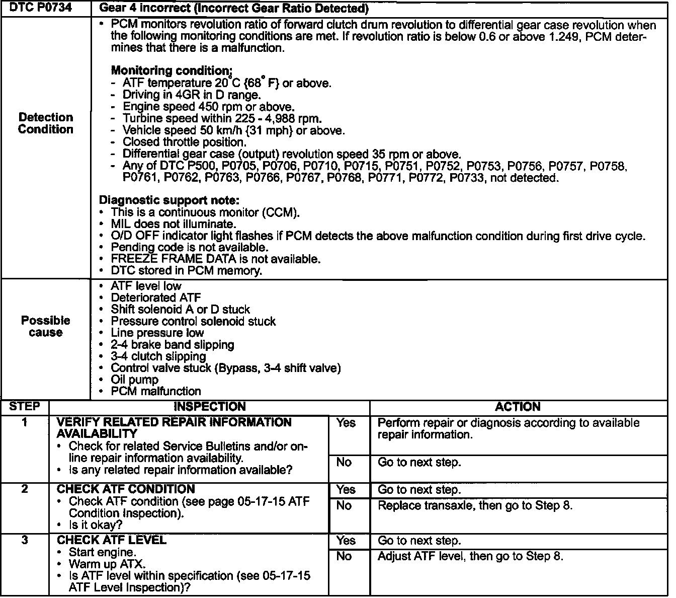 ^ If DTCs P0732, P0733, and/or P0734 re-appear, use the service diagnostics in this bulletin. A Workshop Manual update will be issued which will contain these diagnostics.
