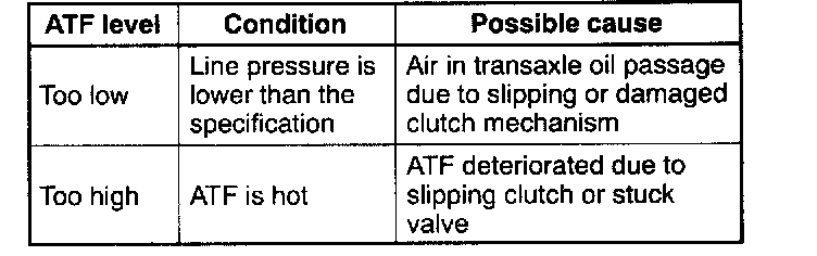 Note If the ATF level is too high or too low in hot condition, the cause of the following problems are shown above.