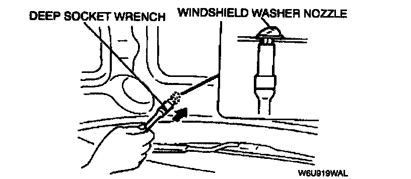 3. Remove the windshield washer nozzle by using a 10 mm {0.4 in} deep socket wrench from underneath the hood.