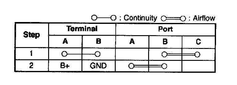 2. Inspect for air flow between each port under the following conditions. If not as specified, replace the VRIS solenoid valves No.1 and No.2.