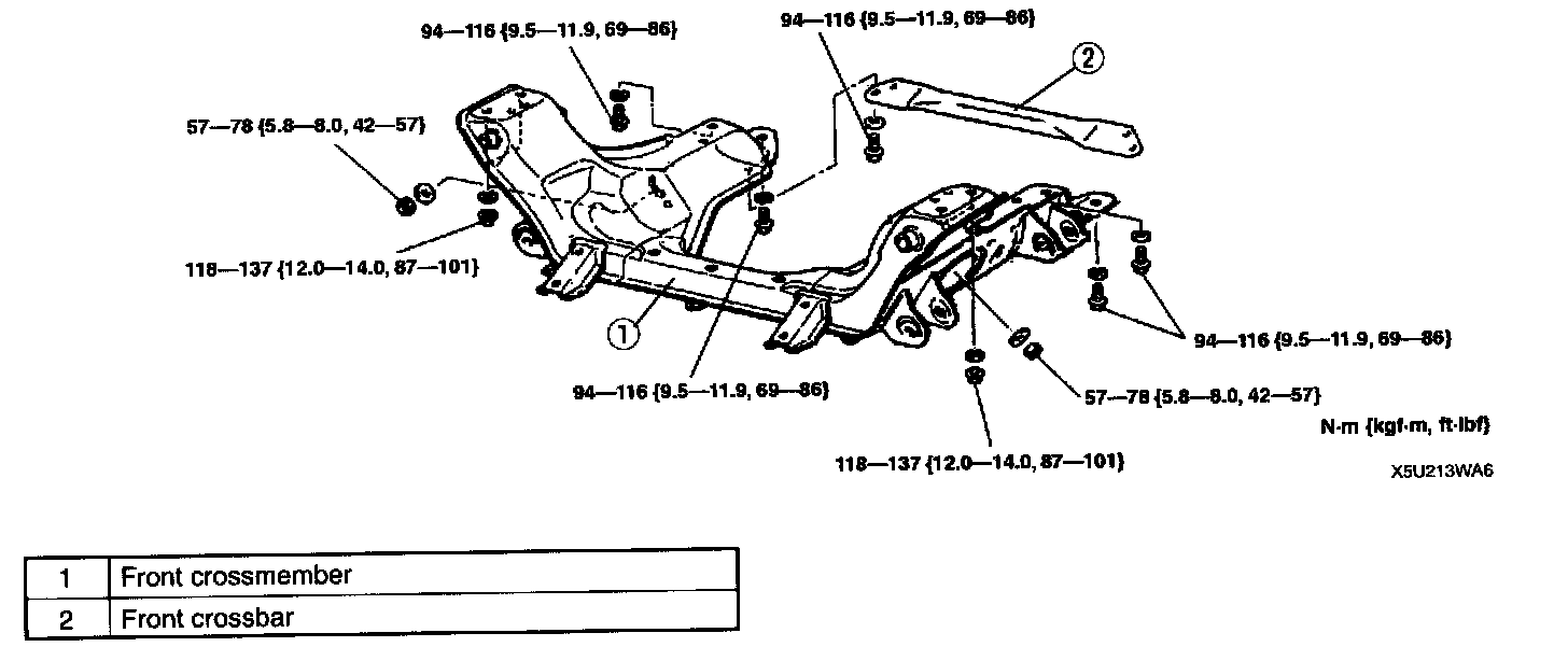 FRONT CROSSMEMBER REMOVAL/INSTALLATIONCaution Performing the following procedures without first removing the ABS wheel-speed sensor may possibly cause an open circuit in the harness if it is pulled by mistake. Before performing the following procedures, remove the ABS wheel-speed sensor (axle side) and fix it to an appropriate place where the sensor will not be pulled by mistake while servicing the vehicle.