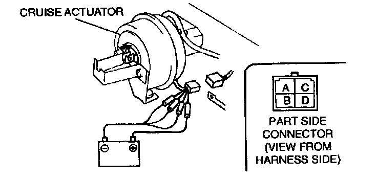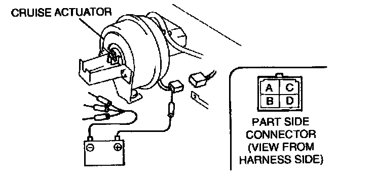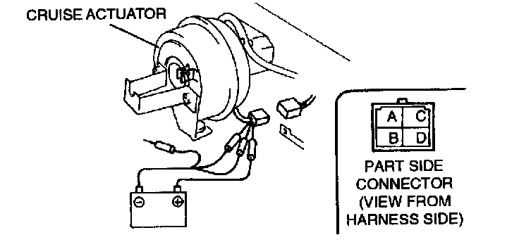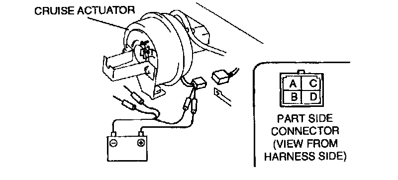 4. Confirm that the diaphragm is drawn into the cruise actuator when battery positive voltage is connected to terminal C and terminals A, B and D are connected to the ground.