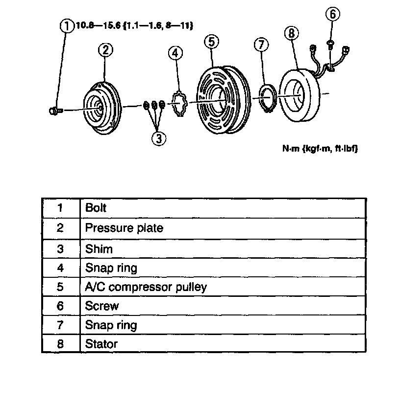 1. Remove the A/C compressor.2. Disassemble in the order indicated in the table.
