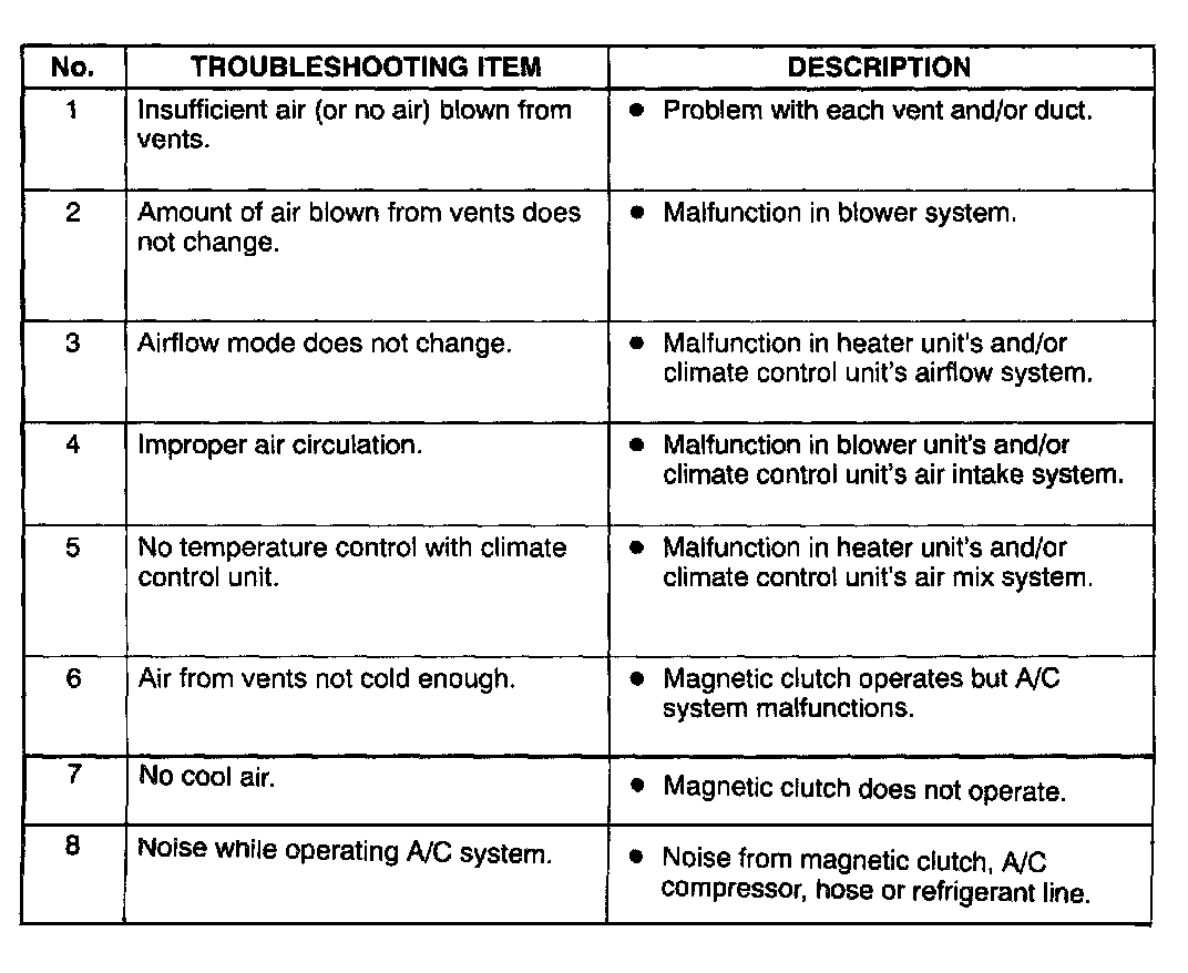 - The areas for inspection (steps) are given according to various circuit malfunctions. Use the chart shown to verify the symptoms of the trouble in order to diagnose the appropriate area.