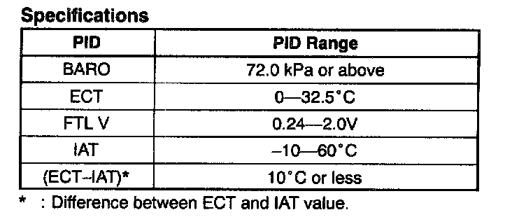 19. Verify that (FTP2SV - FTP1SV) value is within the specification in the table according to the BARO and ECT PID values recorded in Step 6.