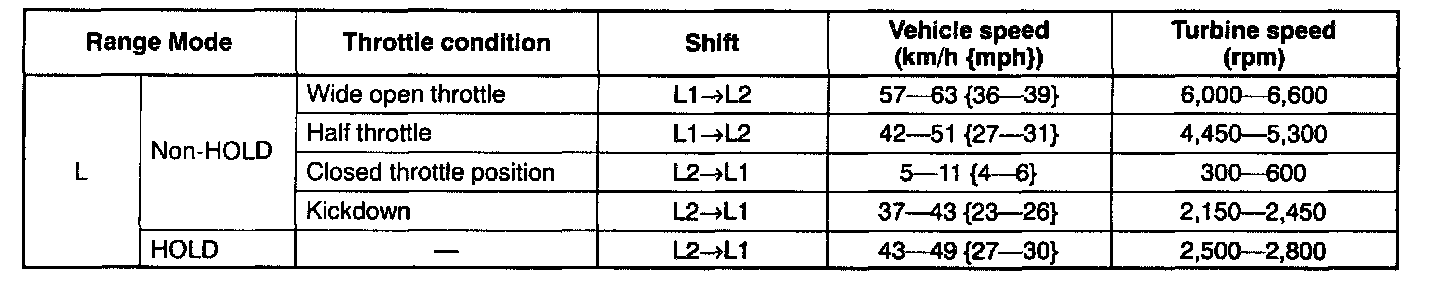 9. Accelerate the vehicle with half- and WOT and verify that 2GR is held. The shift points must be as shown in the table.