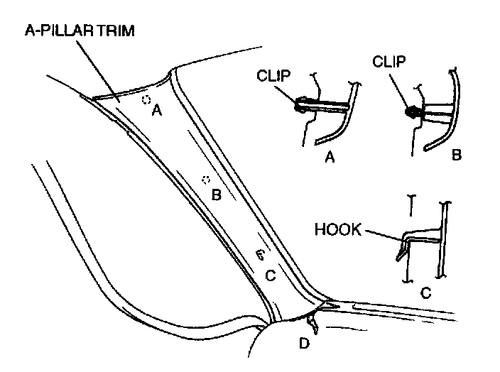 Pull the A-pillar trim upward, then disengage hook C and D.