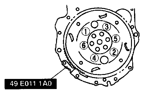 6. Tighten the drive plate installation bolts in 2 or 3 steps as shown.
