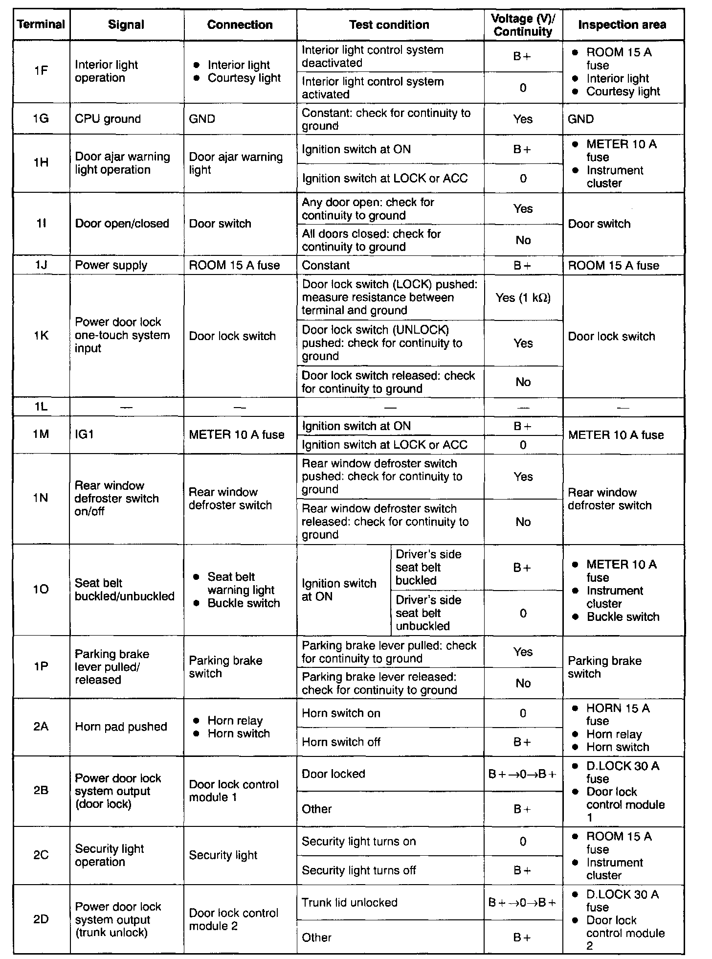 5. If not as specified, inspect the parts listed under Inspection area" and the related wiring harnesses.