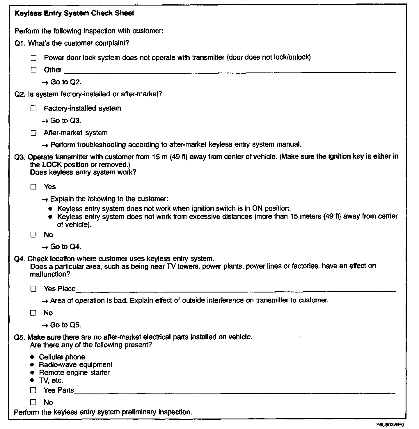 - If the symptom is "Power door lock system does not operate with transmitter at all" find out how the customer uses the keyless entry system according to check sheet.