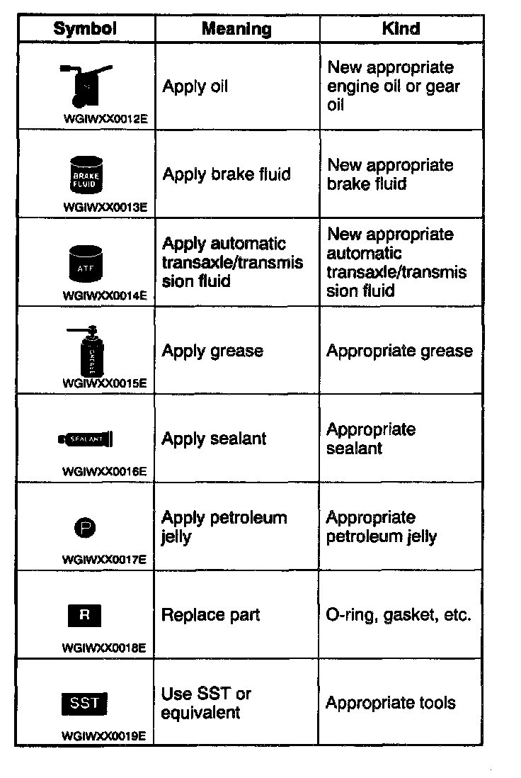 - There are eight symbols indicating oil, grease, fluids, sealant, and the use of SST or equivalent. These symbols show application points or use of these materials during service.
