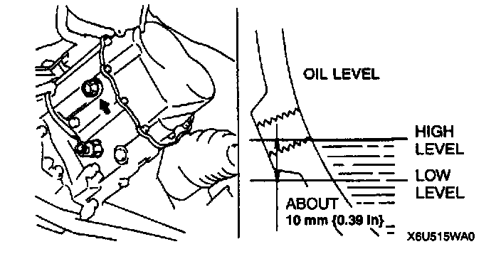 - If the oil level is lower than the low level, add the specified type of oil to the bottom of the plug port through the oil level plug hole.