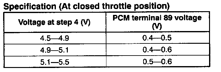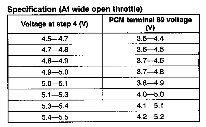 8. When the throttle valve is at the wide open throttle, verify that the PCM terminal 89 voltage is in the specification.