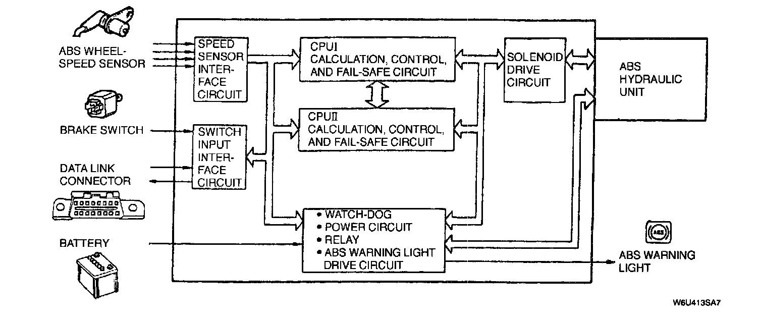 - The ABS control module detects wheel speeds and evaluates the situation of the wheels based on the signals from the speed sensors.