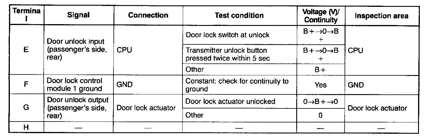 1. Measure the voltage at the door lock control module 2 terminals as indicated below.