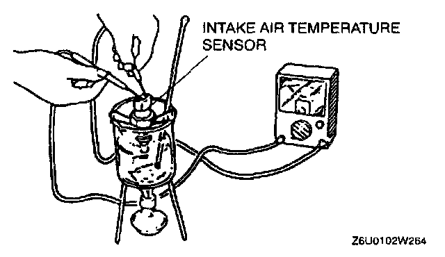 1. Remove the intake air temperature sensor.2. Place the intake air temperature sensor in water with a thermometer, and heat the water gradually.