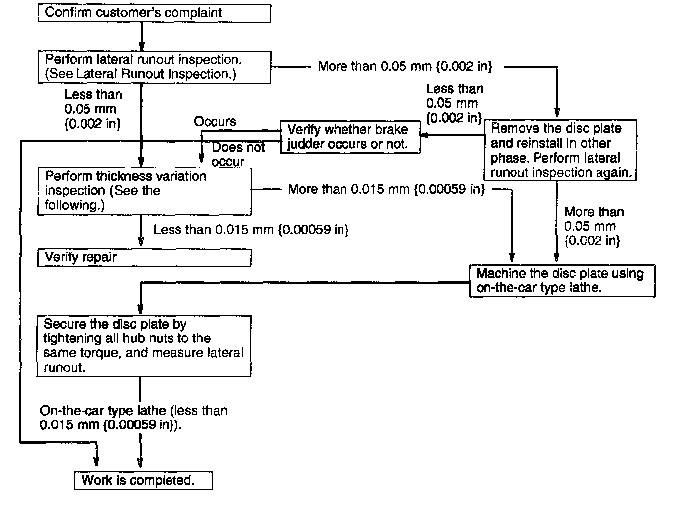 1. If the runout is more than 0.05 mm (0.002 inch) 10 mm (0.39 inch) from the disc plate edge, an uneven wear occurs on the disc plate because the pad contacts the plate unevenly.